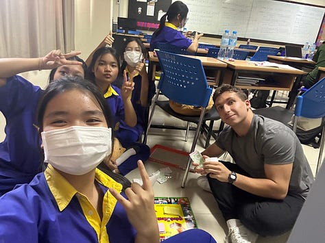 After one week of shadowing the Thai teachers teaching all in Thai, it was finally my time to start. I am teaching 8th, 10th, and 12th grade math. But, for some context, it should be known that out of the 110 teachers in my cohort, there is a huge range in terms of the teaching jobs themselves - 2 year olds to 18 year olds, public or private, city or rural, subjects, seriousness of the school, etc.